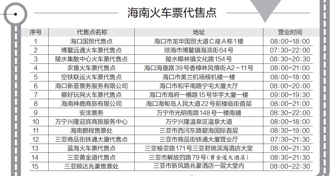 根據中國鐵路12306網站提供的信息,海南有15個代售點,分布于海口、三亞、瓊海、陵水等地。