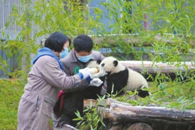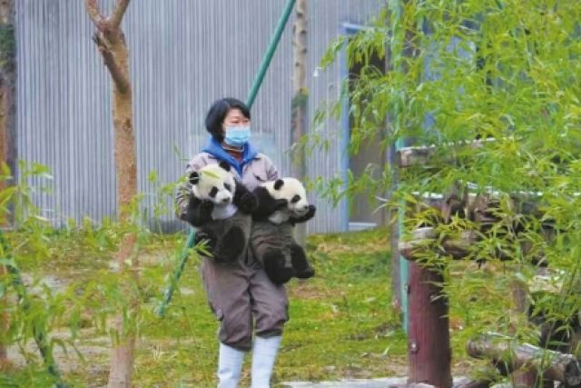 飼養(yǎng)員抱著“和和”“美美”。