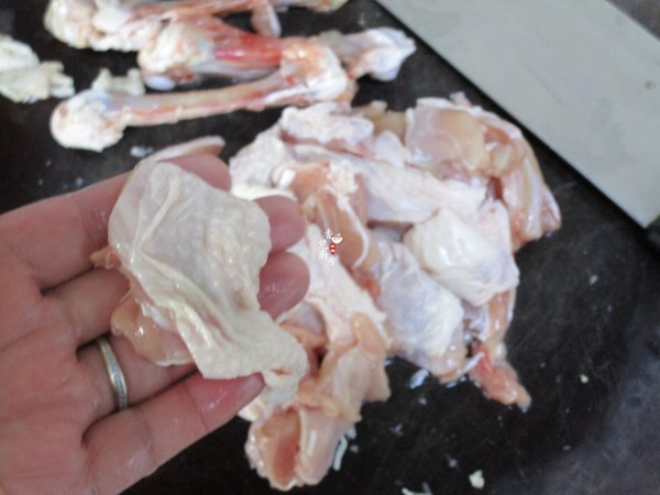 2.用刀順著雞腿骨頭的地方切開后再沿著雞骨剔下骨頭,再切成這樣的塊狀,骨頭剔的干凈一些,我不要了,也可以用來燒湯吃