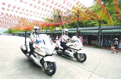 三亞旅游警察在景區(qū)巡邏。
