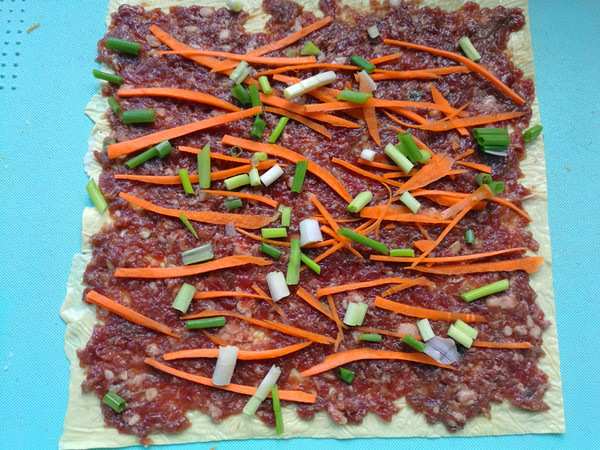 4.然后隨意撒上切成細絲的胡蘿卜絲,和切碎的小香蔥。