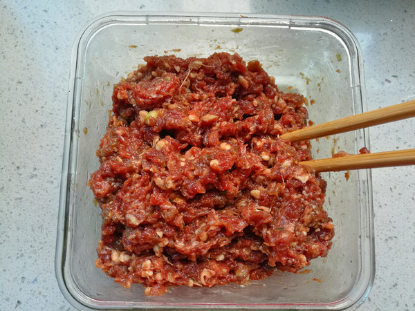 1.先準備好制作豆皮牛肉卷,所需要的各種材料。牛肉餡加入料酒、胡椒粉、生抽、老抽、鹽、蠔油,用兩雙筷子順著一個方向用力攪拌,攪拌到肉餡上勁,有點吃力的感覺,肉餡出現粘稠的狀態,就可以停止。(需要注意,肉餡到這個狀態就不能再攪拌了,再攪拌下去肉餡就會過度,會出現湯、肉分離的狀態。)再加入切碎的小香蔥、姜末、雞精或雞粉、香油,再次攪拌均勻,肉餡就調好了。