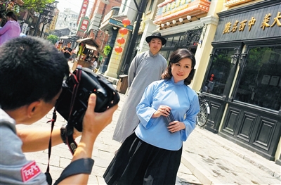 ?一對情侶在電影公社拍攝民國風的照片。 本報記者 張杰 攝