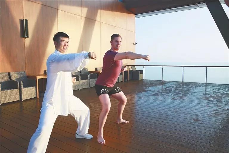 ↑在博鰲一養(yǎng)護中心,運動教練在教俄羅斯外賓打太極。