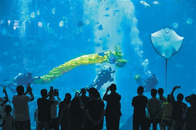 2月5日,新春大年初一,三亞·亞特蘭蒂斯酒店,潛水員舞動“南海龍王”在海底世界與各種魚兒暢游共舞,吸引游客駐足觀賞。本報記者 王凱 攝
