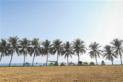 ?2月10日,萬寧日月灣,游客在海邊搭帳篷休息。本版圖片均由本報記者 袁琛 攝