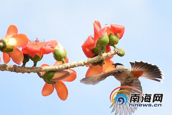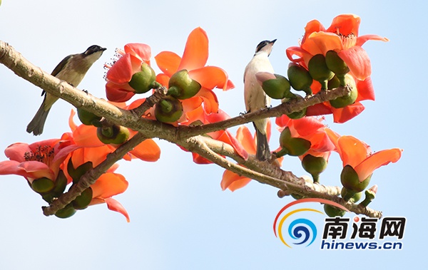 又是一年木棉花時節,南海網網友張光煌用鏡頭記錄下海口街頭綻放的木棉花,鳥兒銜花香。