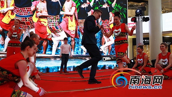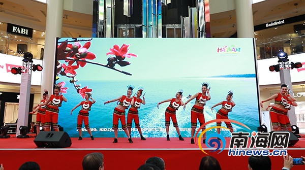 展會現場,傳統舞蹈《久久不見久久見》、黎族特色舞蹈《三月三》、贈送貝殼制作的海南特色禮品、竹竿舞互動等獨具三亞特色的節目在莫斯科阿特里姆商業中心上演。