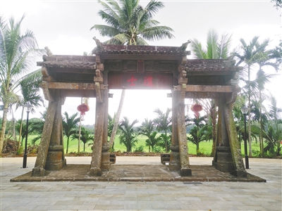 一條硬化村道穿過門墻,通往綠樹環(huán)繞的村莊,檳榔林、青皮竹林、椰樹林相間植于道路兩旁,散落的民居在林間隱約可見。行車不到10分鐘,眼前便出現(xiàn)一片開闊的田洋,嫩綠的禾苗沐浴著陽光,一座全石結(jié)構(gòu)的古牌坊面田洋而立,格外醒目。