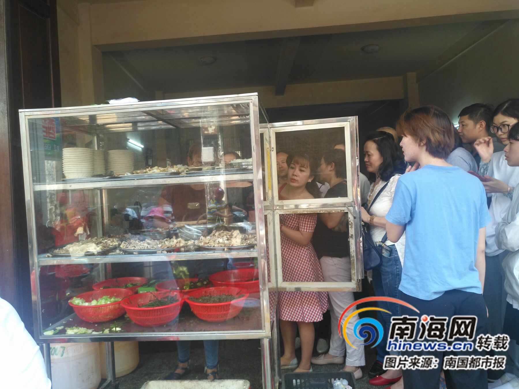 3月21日中午,記者來到鋪前鎮勝利街,在海南很難找到這樣直通港口且保存完好的騎樓老街,頗能感受到清末口岸的氣息。鋪前有4家糟粕醋店,但最出名的“阿妹糟粕醋”店和“林花糟粕醋”店都位于勝利街,相距約20米。在現場,很多市民游客在糟粕醋店前排起長隊。每家糟粕醋店里和店外的走廊都擺了10多張大餐桌,甚至要借用鄰居的房子擺桌,坐滿了食客,但遠遠不夠用,很多人排隊等候1個多小時才能輪到自己享口福。