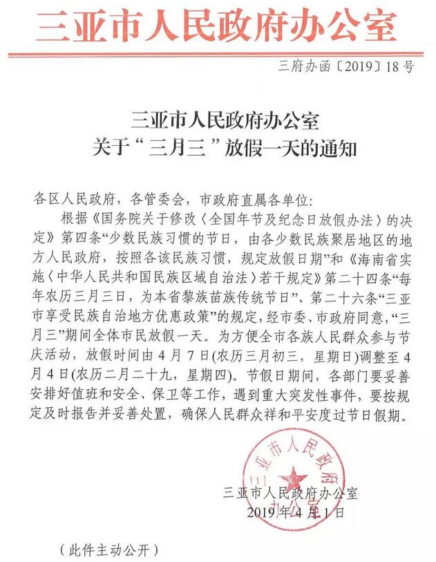 根據《國務院關于修改〈全國年節及紀念日放假辦法〉的決定》第四條“少數民族習慣的節日,由各少數民族聚居地區的地方人民政府,按照各該民族習慣,規定放假日期” 和《海南省實施〈中華人民共和國民族區域自治法〉若干規定》第二十四條“每年農歷三月三日,為本省黎族苗族傳統節日”、第二十六條“三亞市享受民族自治地方優惠政策”的規定,經市委、市政府同意,“三月三”期間全體市民放假一天。為方便全市各族人民群眾參與節慶活動,放假時間由4月7日 (農歷三月初三,星期日)調整至4月4日 (農歷二月二十九,星期四 )。節假日期間,各部門要妥善安排好值班和安全、保衛等工作,遇到重大突發性事件,要按規定及時報告并妥善處置,確保人民群眾祥和平安度過節日假期。