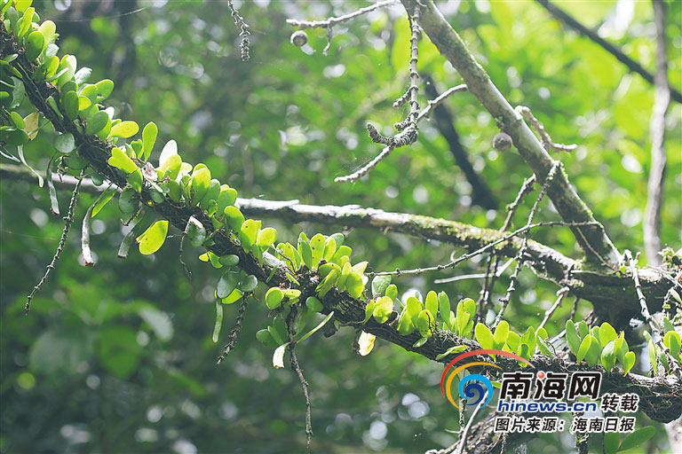 “你看,那邊是鳥巢蕨、崖姜蕨,這些又是鵝掌蕨、麒麟葉等,百花嶺里的蕨類植物還有其他的附生植物種類很豐富,長勢也很好,這在海南的眾多林區里實屬不多見?!秉S青良介紹,一些大型的蕨類植物大都喜生于陰濕的熱帶和亞熱帶雨林和季雨林環境,是雨林生物鏈鏈條里一個不可或缺的元素,不少蕨類植物對生態環境條件較為挑剔,部分種類生長是否繁茂,甚至可以作為當地生態環境“評優”的參照標準。顯然,在他眼里,百花嶺的生態環境分數為“優”。