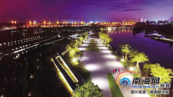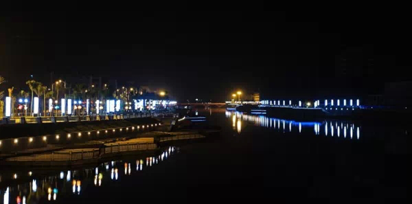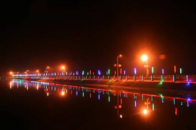 每到夜晚,河岸一排排霓虹閃爍。把白沙生態(tài)文化公園和水岸新世紀籠罩在流光溢彩的燈火海洋之中。