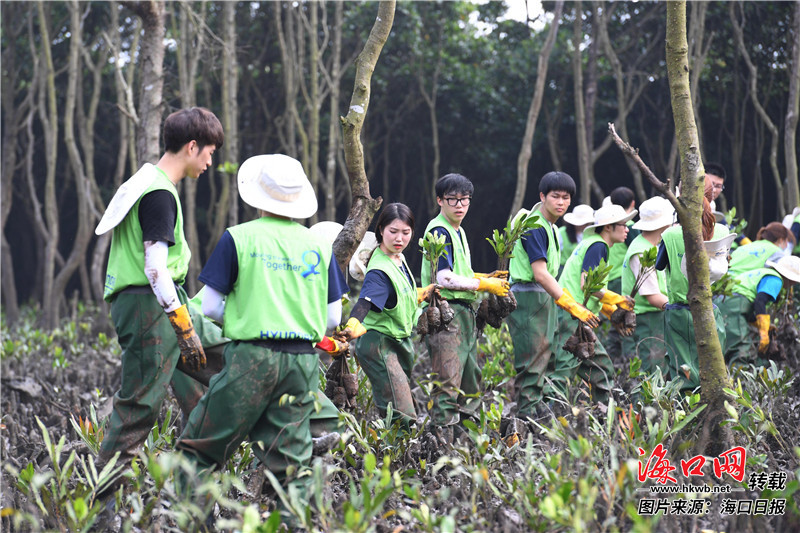 中韓志愿者在東寨港國家級自然保護區內栽種紅樹苗木。石中華 攝
