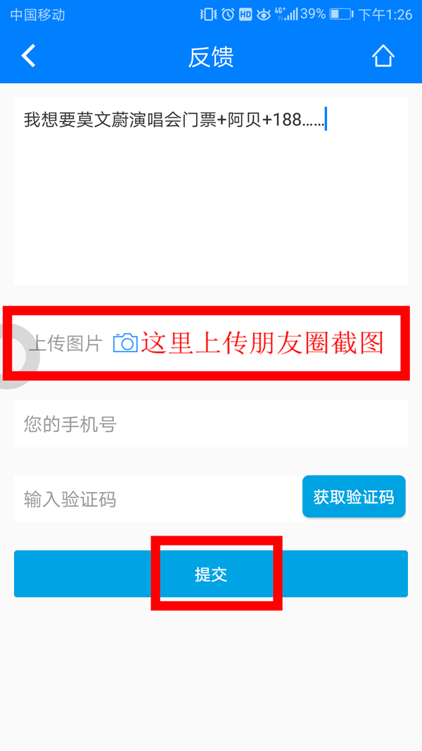 第二步:打開南海網(wǎng)客戶端,點擊右上角,進入留言反饋頁面填寫:“莫文蔚演唱會門票+姓名+電話”(舉例:莫文蔚演唱會門票+阿貝+188XXXXXXXX),并將朋友圈分享截圖上傳,提交后即可成功參與活動!