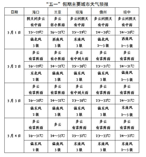 另外,海南省氣象臺預計,“五一”假期期間,海南省無高溫,但多雷雨天氣,具體預報如下: