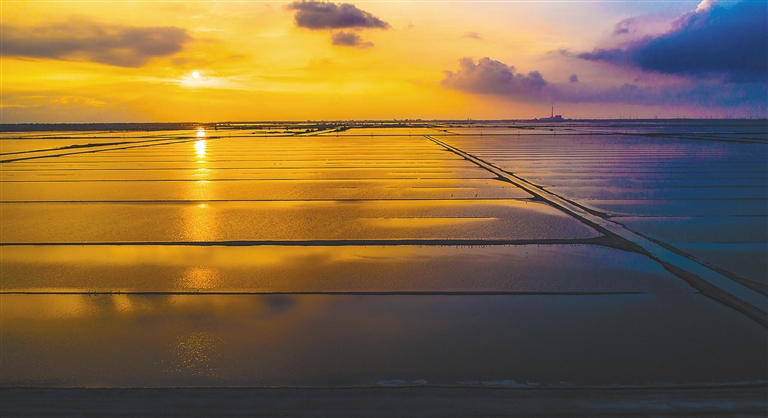 金色晚霞映照在樂東鶯歌海鹽場鹽田上。