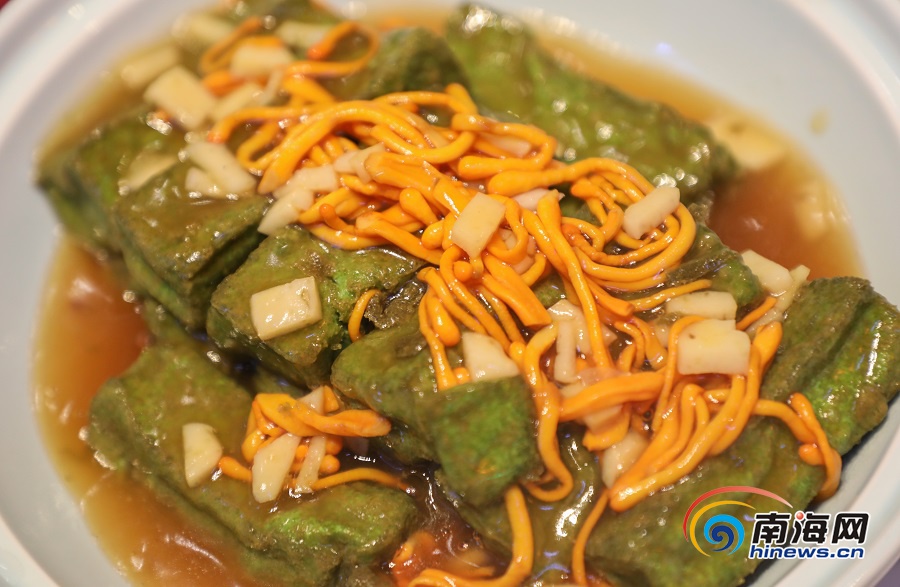 除了各種好吃的鴨,文秀煮鴨也將瓊劇里三小姐愛吃的素食做成一道道獨具特色的美食,其中“三小姐豆腐”集“顏值”與營養為一體,成為顧客非常喜歡的一道美味。程店長指著一盤嫩綠色、掛著濃汁兒的豆腐不無自豪地介紹:“三小姐豆腐是我們的一道自創菜,以菠菜、豆腐、雞蛋為主要原料,營養價值非常豐富。”