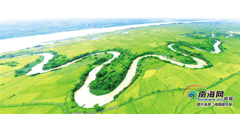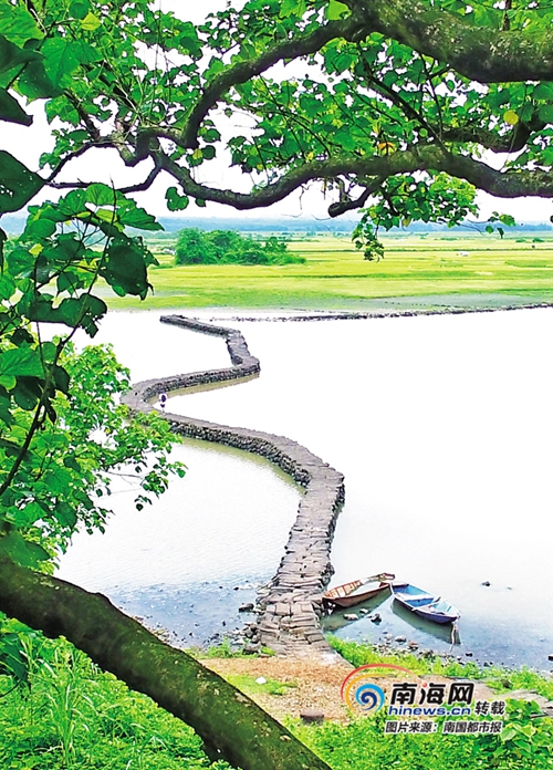 有著近600年歷史的古蛇橋彎曲地伏臥在水面上,伸向遼闊的新舊溝田洋中。在火山巖石堆積而成的新舊溝護壩上,兩條細長的新舊溝里奔涌著清澈的泉水,滋潤著護壩兩側的農作物。在航拍圖里,可見河流彎彎曲曲,千回百轉,從西向東,滋潤著萬畝良田,最終匯入南渡江。這就是海口將要打造的新舊溝鄉村濕地公園所在地。