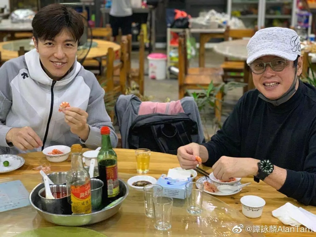 ↑譚詠麟低調現身海口丁村火車頭萬人海鮮廣場,與友人品嘗美味海鮮。圖片來源于譚詠麟微博