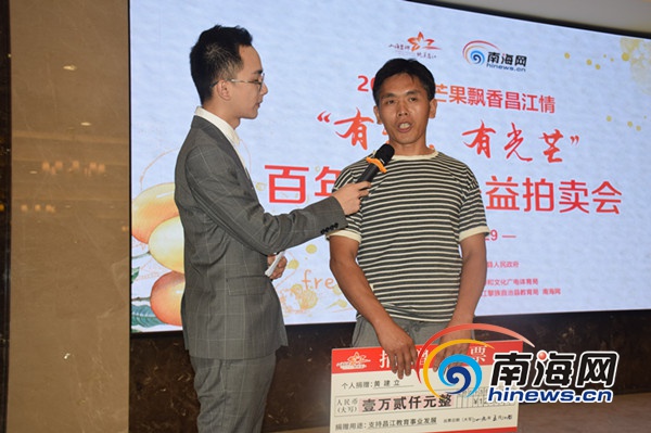 海南旅游頭條、南海網、南海網客戶端昌江5月29日消息(南海網記者 劉麗萍 葉子青) 5月29日,2019年昌江百年芒果公益拍賣會在昌江松之光酒店舉行。除了企業的愛心競拍,現場還有不少愛心人士主動認捐,來自海南海順實業開發有限公司的職工黃建立以個人名義捐贈1.2萬元,他的初衷很簡單,“小時候家庭貧困沒有完成學業,這是我一生的遺憾,現在條件稍微好了,想為昌江的貧困學子盡一份力?!?/span>