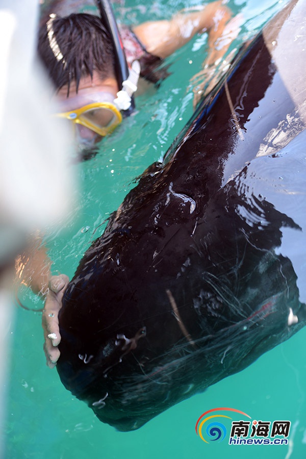 潛水員用身體當(dāng)“人墻”擋住領(lǐng)航鯨,避免它撞到硬物。南海網(wǎng)記者 沙曉峰攝