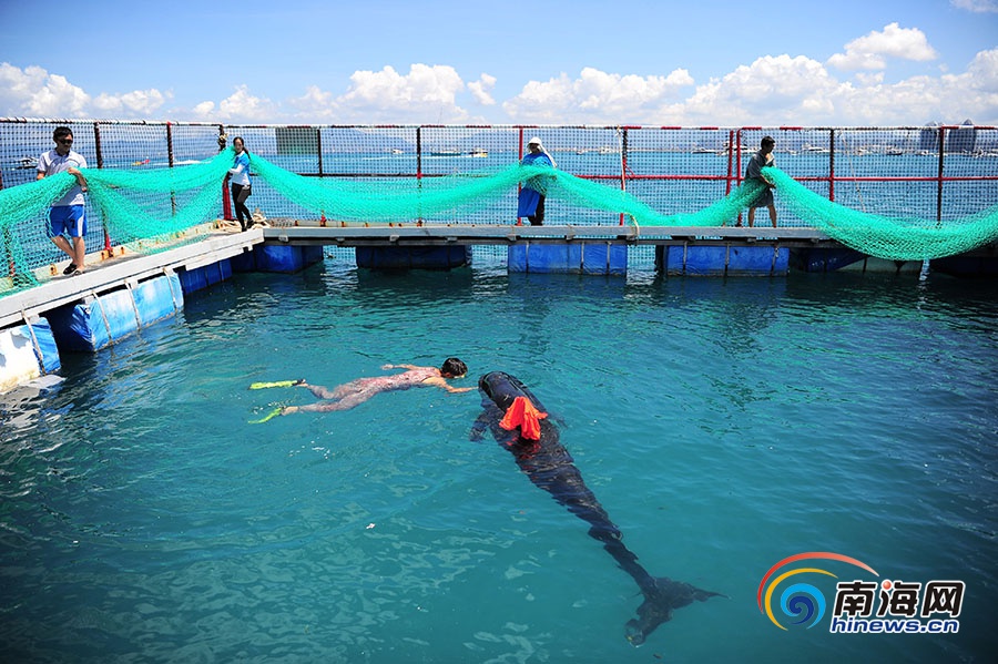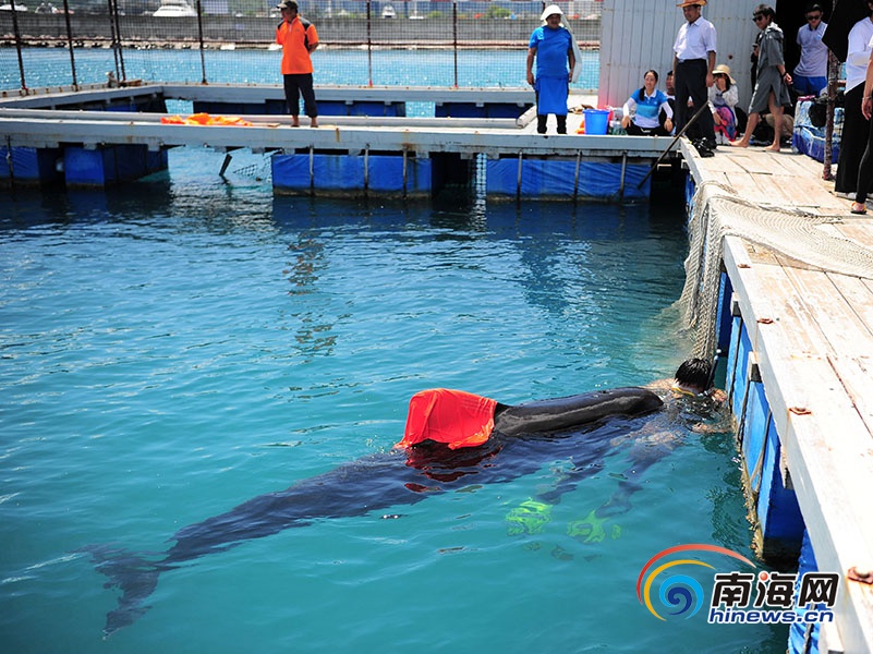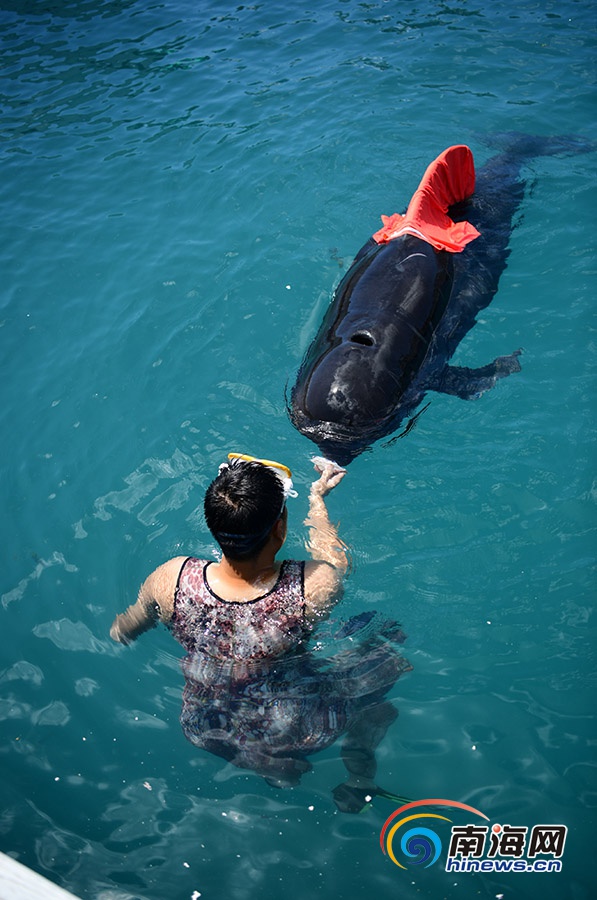 6月8日,三亞,潛水員給領(lǐng)航鯨喂食。南海網(wǎng)記者 沙曉峰攝