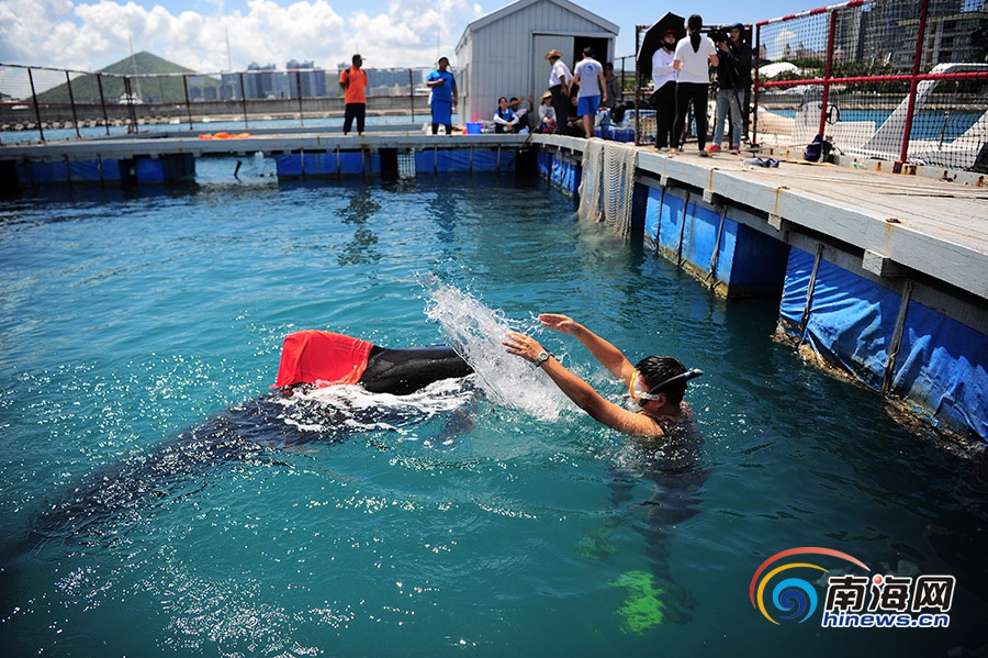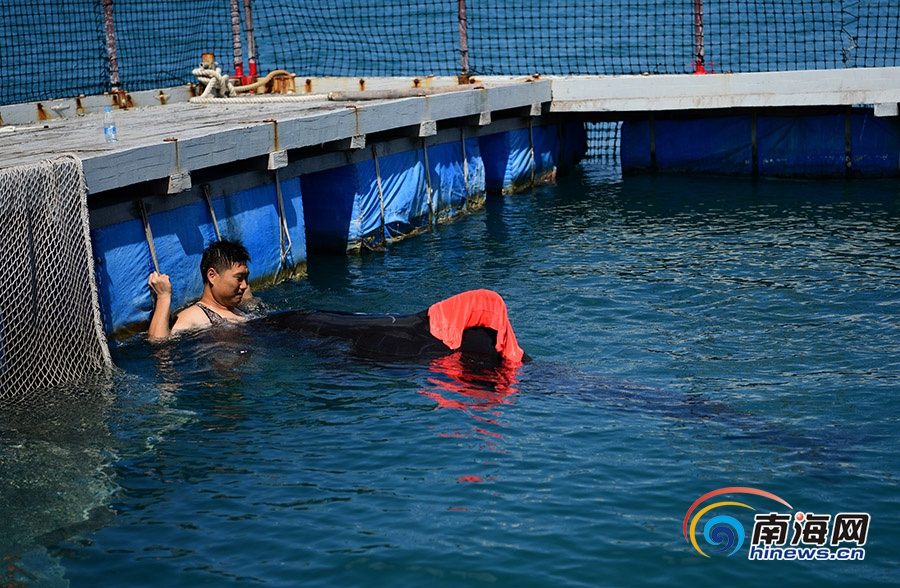 潛水員劃水給領(lǐng)航鯨降溫。南海網(wǎng)記者 沙曉峰攝