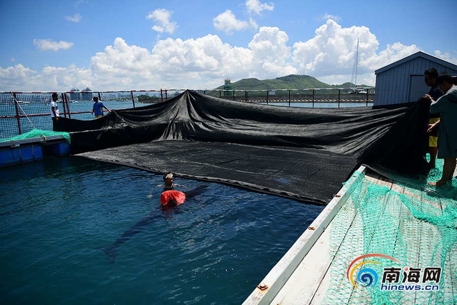 救援人員在海上平臺(tái)為領(lǐng)航鯨搭防曬網(wǎng)。南海網(wǎng)記者 沙曉峰攝