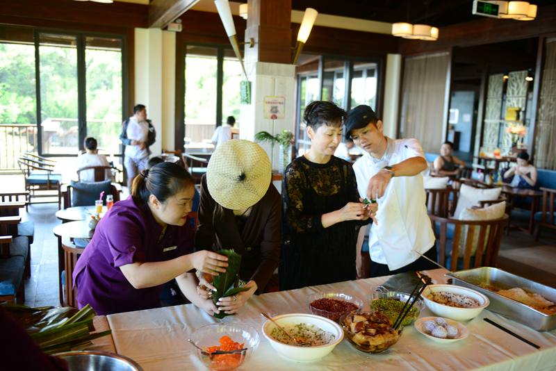 端午節當天,鳥巢度假村在云頂大堂吧舉辦包粽子活動,來自五湖四海的住店客人親身體驗了這一傳統民俗活動。包好的粽子經過登記與烹煮后,客人還可以免費品嘗到親手包的粽子。除外,鳥巢度假村在端午節當天,推出餐廳單點用餐即送粽子的活動,讓更多游客歡度佳節。