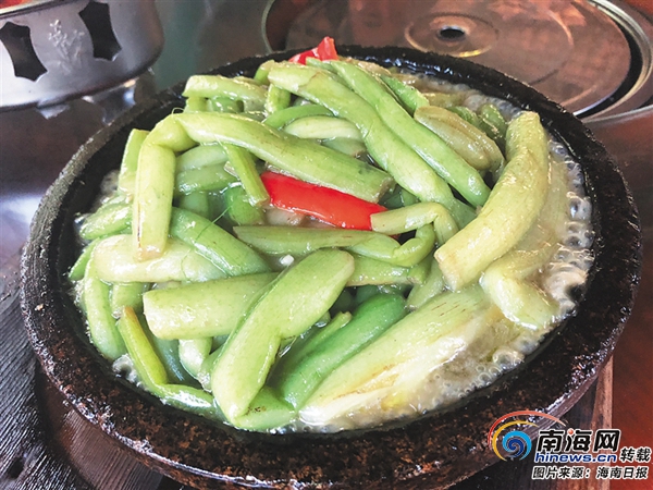 在瓊海市溫泉鎮,有一家以農家小院為用餐場所、以當地特色農家菜為主打菜肴的餐廳十分火爆。“到我們這,一定要品嘗溫泉鵝。另外,還要嘗嘗鐵板鮮芋梗,這是我們的‘網紅菜’,很受顧客的喜愛?!狈諉T熱情地向食客推薦特色菜。