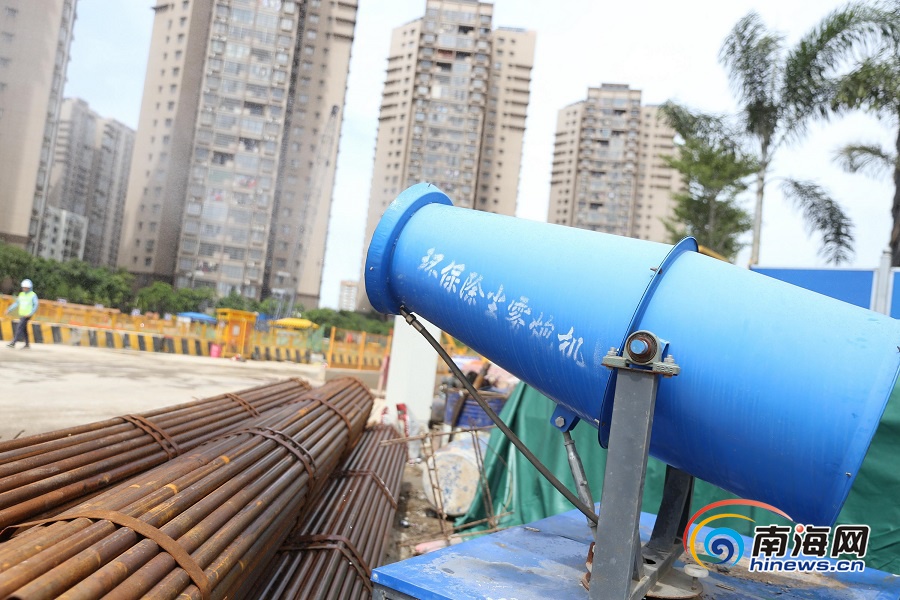 6月23日,在海口首條越江隧道——文明東越江通道項目施工現場,霧炮機噴水氣降溫,給工人營造一個清涼的工作環境。海報集團全媒體中心記者 張茂 攝