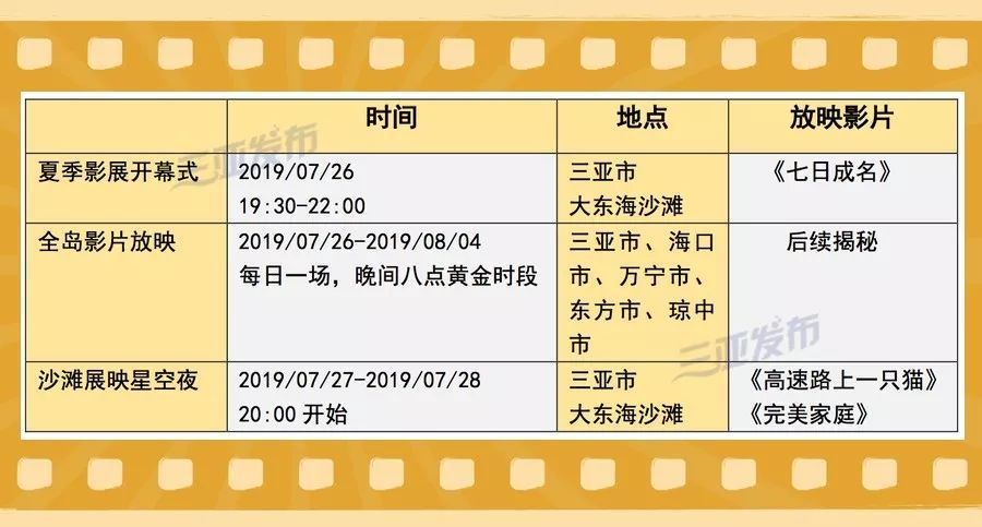 The film festival will be held daily in Sanya,Haikou,Wanning,Dongfang and Qiongzhong City.The screening time will be from 8:00 pm every Monday to Sunday.