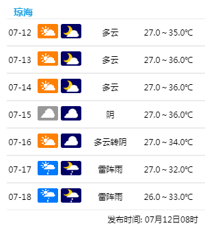 12日下午到夜間:北部灣海面,本島西部、東部和南部海面,西沙、中沙群島附近海面,多云有陣雨,偏南風5級,陣風6-7級;瓊州海峽,多云有陣雨,偏南風5級,陣風6級;南沙群島附近海面,多云有雷陣雨,西南風5-6級,雷雨時陣風7級。