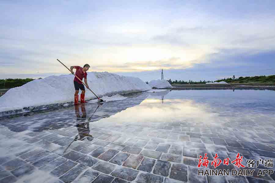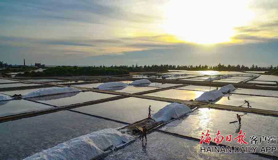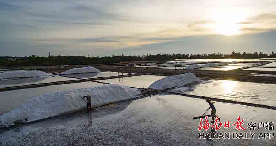 7月14日,在海南省東方市東方鹽場,鹽工們忙著曬鹽收鹽。時下正值曬鹽旺季,日落鹽場收鹽成為美景,吸引影友和游人拍攝參觀。海南日報記者陳元才 見習記者李天平 攝