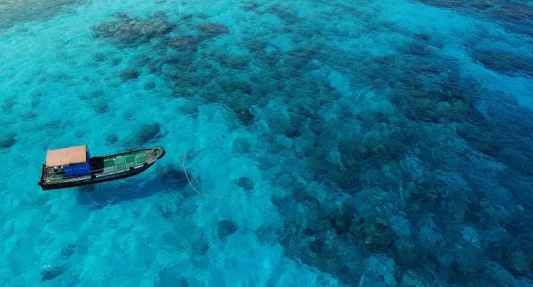 這是西沙永樂群島的甘泉島附近的海面(2017年4月23日無人機(jī)拍攝)。新華社記者 郭程 攝