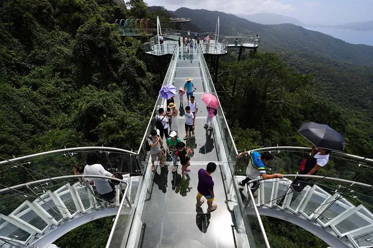 游客在三亞市亞龍灣熱帶天堂森林公園的玻璃棧道上參觀游覽(2018年8月31日攝)。新華社記者 郭程 攝
