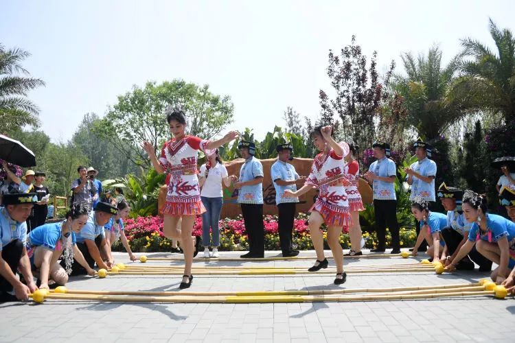 7月21日,演職人員在北京世園會海南園表演竹竿舞。新華社記者 張晨霖 攝