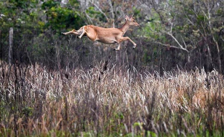 一只坡鹿在海南大田國家級自然保護(hù)區(qū)跳躍(2018年4月3日攝)。新華社記者 楊冠宇 攝