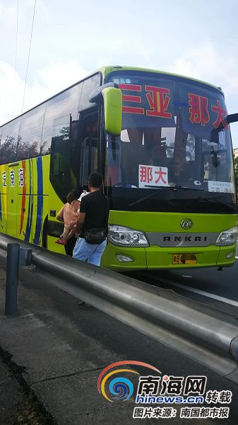 9時(shí)33分許,一輛前擋風(fēng)玻璃上標(biāo)有三亞、那大字眼的大客車從高速上駛來,這位婦女見狀便抬手?jǐn)r車,客車減速停在了應(yīng)急車道上??蛙囅聛硪幻凶訌膵D女手中接過小孩,隨后,婦女拿起行李登上客車。