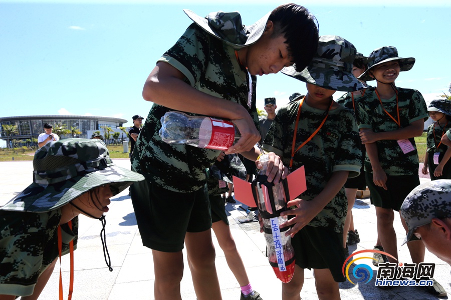 小營員往“水火箭”里注水,準備發射。 南海網記者陳望 攝