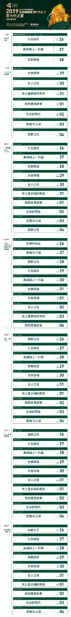 影展將開啟為期兩周的意大利電影全島影片放映,精選十部意大利高分電影,其中大部分是廣受國內(nèi)影迷關(guān)注的影片。開幕影片確定為一經(jīng)上映便取得票房佳績的意大利影片《七日成名》。