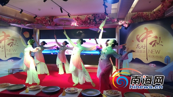 品鑒會(huì)現(xiàn)場(chǎng),禮儀小姐展示今日上市的水晶宮五仁金腿大月餅。南海網(wǎng)見(jiàn)習(xí)記者韓星攝