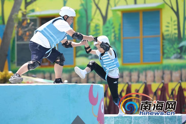 8月8日上午,《嘭!發射》親子競技錄制現場吸引了不少游客和居民的圍觀。現場布置充滿了熱帶雨林風情,黎苗文化元素隨處可見,5個賽道設計充滿“潮漫”風格。參與挑戰的親子家庭需要依次通過彩虹積木橋、扭扭大吸管、怪力彈簧屋、旋轉大腳板和沖刺大爬梯5大關卡,成績最好的家庭將獲得終極大獎。整個過程很考驗親子之間的配合和智勇,兼具趣味性與挑戰性,對于增進親子關系與培養孩子勇氣有很好的作用。
