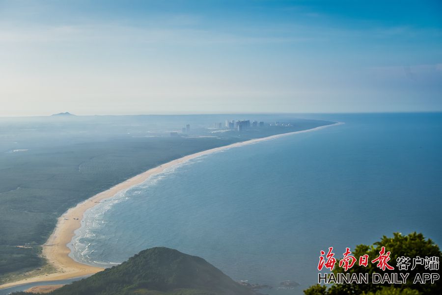 2019年8月6日,在文昌銅鼓嶺景區的山頂觀景臺俯瞰月亮灣,25公里蜿蜒曲折的海岸線,如同一鉤明亮的彎月;南海層層疊疊的滔滔白浪如銀白色的緞帶,漣漪萬千;海中一座座小島、礁石好似中流砥柱迎接著海浪的拍擊。海南日報記者袁琛 見習記者封爍 攝影報道