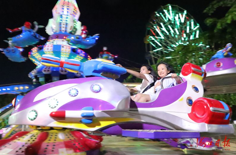 小朋友在火車頭萬人海鮮廣場的游樂設施上開心地玩耍。海口日報見習記者 王程龍 攝