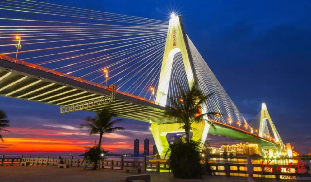 ↑夜色下的世紀大橋燈光璀璨、光芒交織。海口日報記者 蘇弼坤 攝