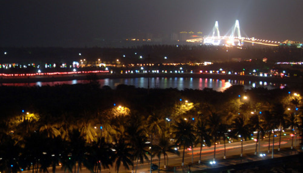 ↑海口市萬綠園和世紀大橋燈火齊明,將海口的夜色裝扮得十分美麗。新華社記者 姜恩宇攝