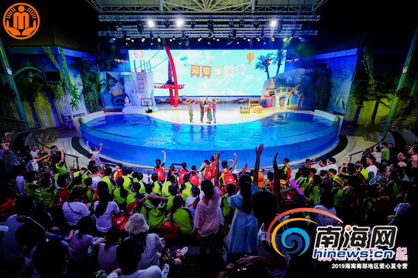 8月16日上午,2019海南南部地區困境(留守)兒童夏令營正式落下帷幕。孩子們在海昌不夜城看海豚表演。 三亞市民政局供圖