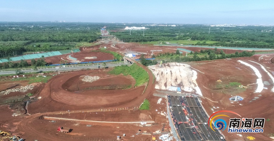 高空俯瞰海口繞城公路美蘭機(jī)場至演豐段工程現(xiàn)場。海報集團(tuán)全媒體中心記者 張茂 攝